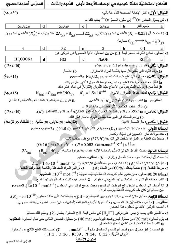 5 نماذج امتحانية شاملة في الوحدات الأربعة الأولى كامل الكتاب ماعدا الكيمياء العضوية بكالوريا 2020 منهاج حديث