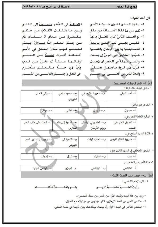 نموذج امتحاني لقصيدة قوة العلم لطلاب الثالث الثانوي العلمي